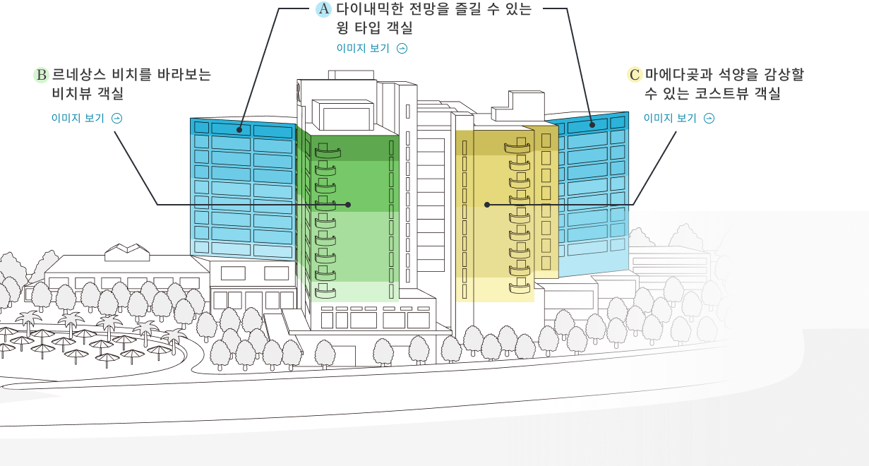 백사장과 수영장이 내려다보이는 생동감 넘치는 해변뷰와, 변화무쌍한 자연의 바다와 하늘을 감상할 수 있는 코스트뷰. 원하는 대로 어떤 보기든 선택할 수 있습니다.