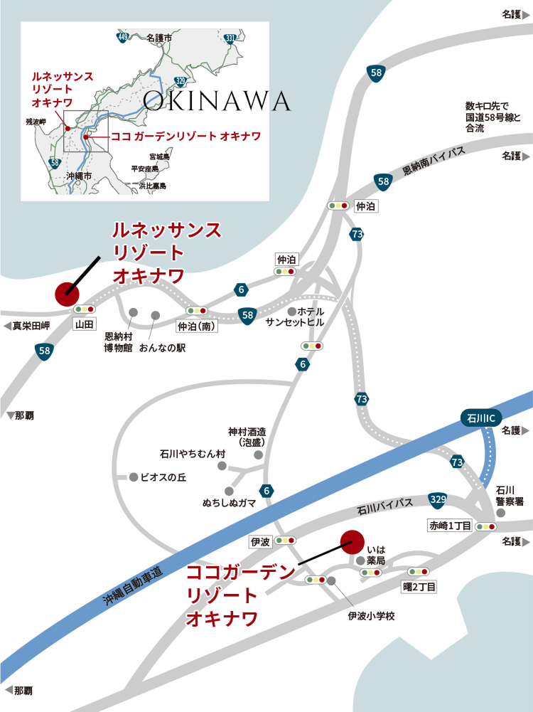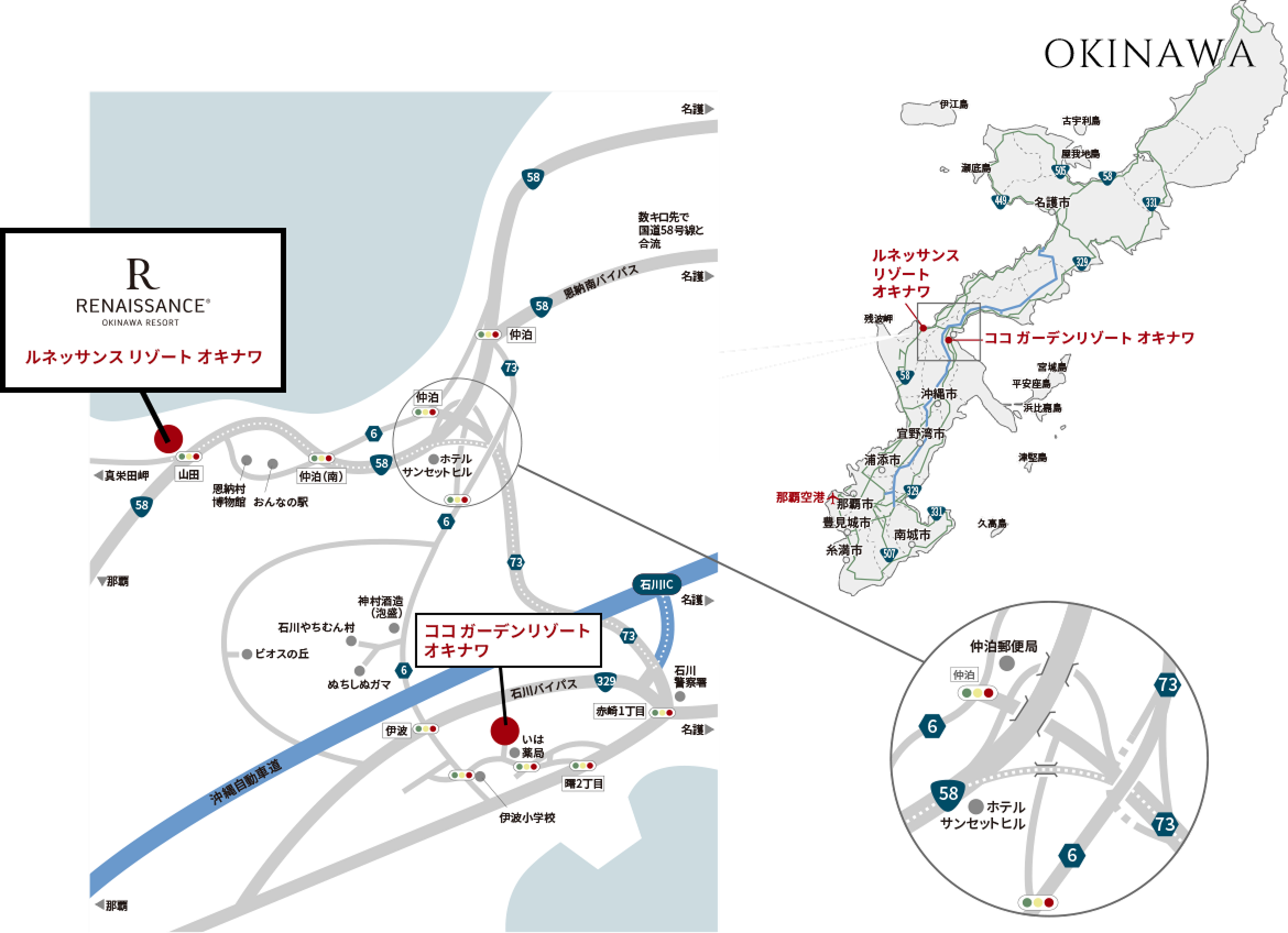 ルネッサンス リゾート オキナワと、グループホテル ココ ガーデンリゾート オキナワを結ぶ
