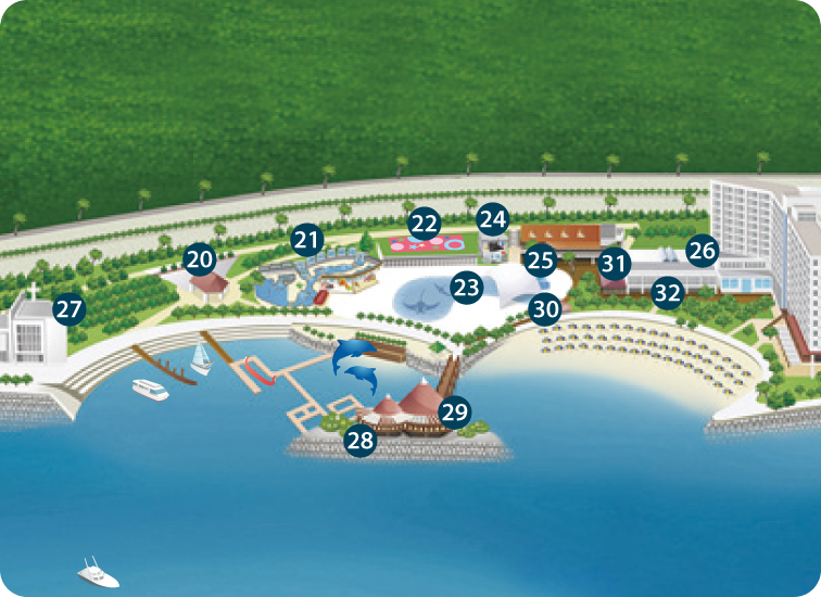 フィットネスジム、山田温泉、マーケットプラザ、チュラ スタイル、THE NORTH FACE / HELLY HANSEN、ショップアベニュー、ドルフィンアイランド、フォトショップ、タラソテラピーサロン、レンタカーデスク |