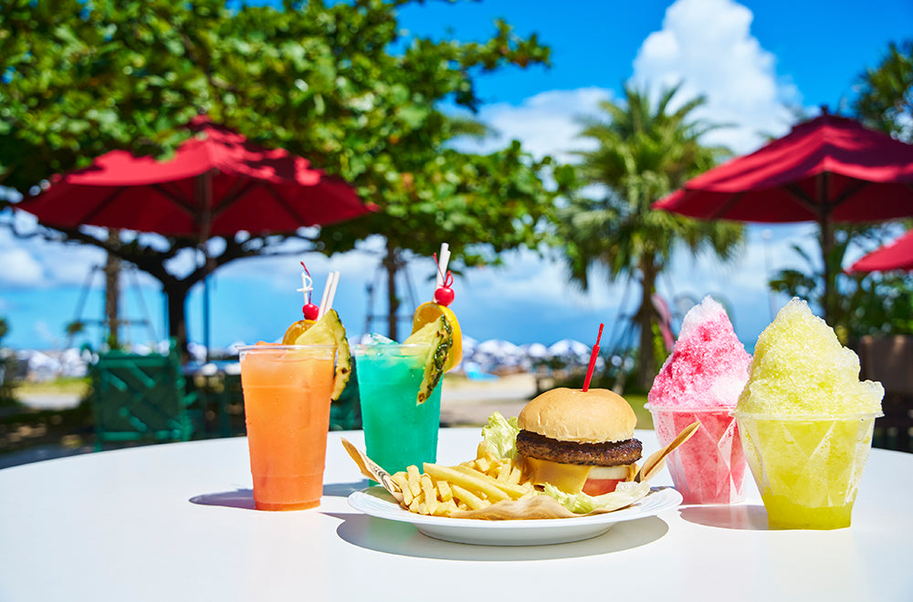 プールやビーチでの水遊びの合間、水着のまま気軽に立ち寄れてボリュームたっぷりのバーガーやトロピカルドリンク、かき氷などカジュアルに楽しめるプールサイドカフェテリア。
