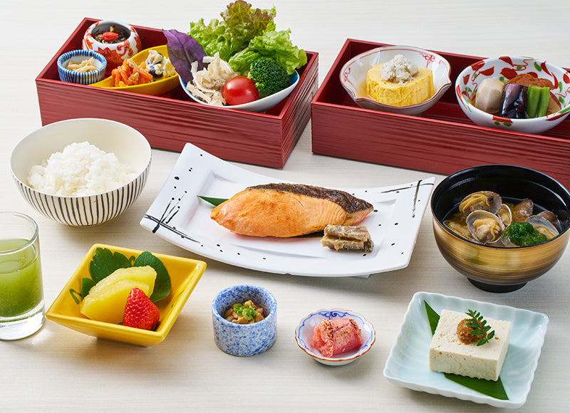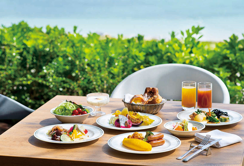 料理長が厳選した魚の炭火焼、沖縄の食材を織り交ぜた小鉢が朱の箱膳に詰まった上品な和朝食。炊き立てのご飯とともにお楽しみください。