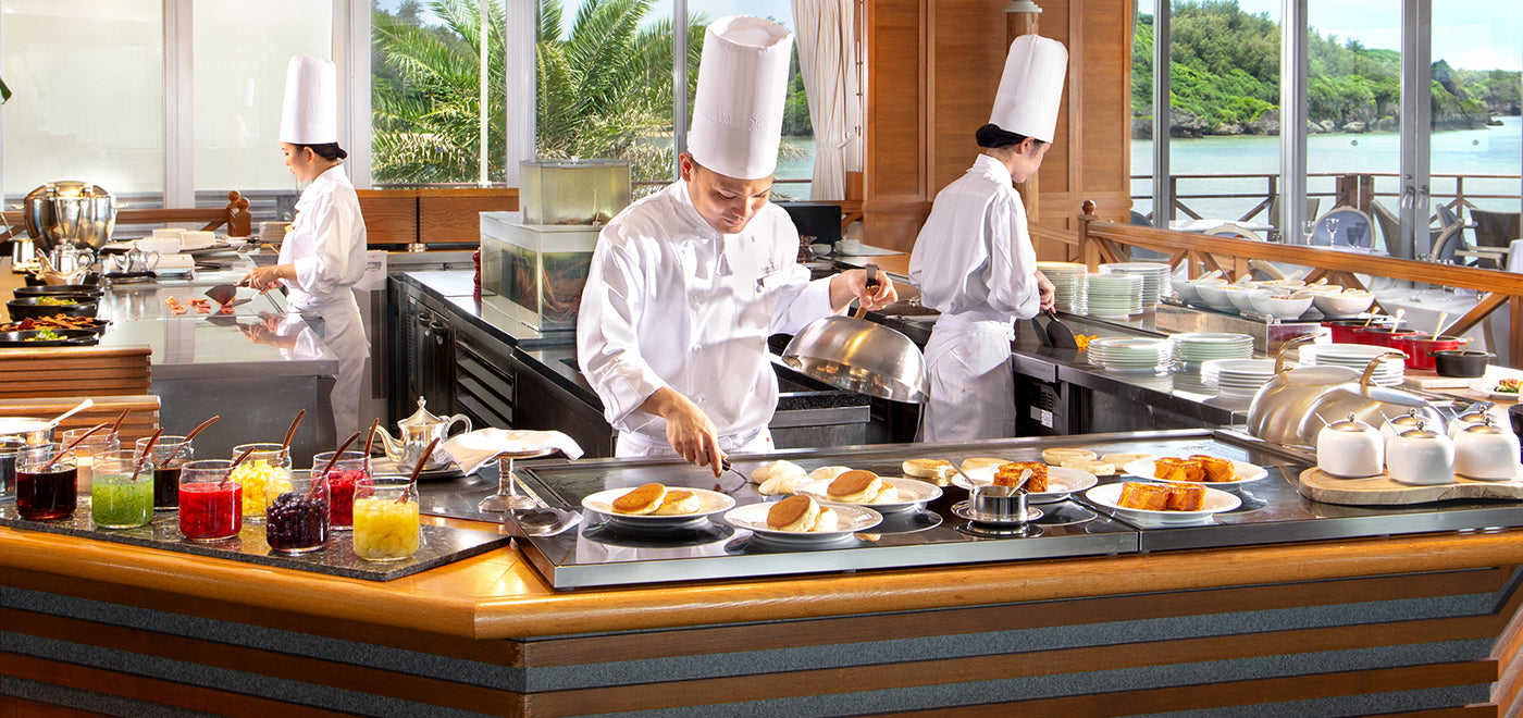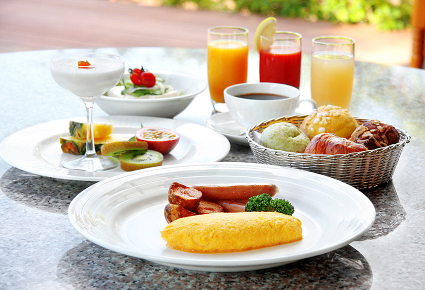 店内のオーブンで焼き上げるパンやオムレツなどの玉子料理、フルーツを絞ってつくるフレッシュジュースなどでリゾートの朝を満喫。