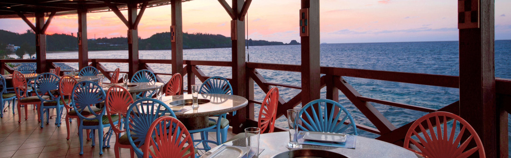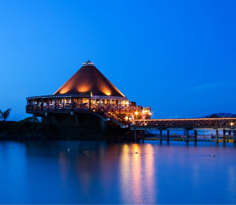 珊瑚礁に浮かぶ三角屋根の海上レストラン。