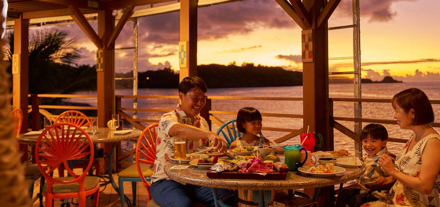 夕暮れ時、サンセットに染まる海を眺めながら厚切りビーフや魚介のバーベキューは格別。