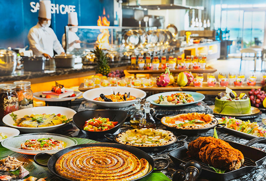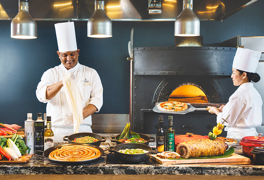 ライブキッチンで作るアジアンフュージョン料理、石窯で焼く出来立てピザなど世界の料理と沖縄を融合したダイナミックな料理の数々をお楽しみください。