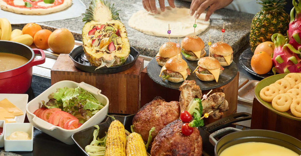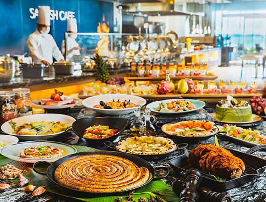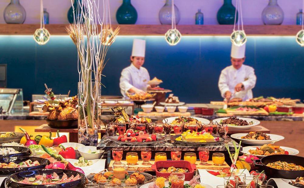 シェフが立ち並ぶライブキッチンから繰り出される旬の食材を使った数々の料理とスイーツをご堪能ください。