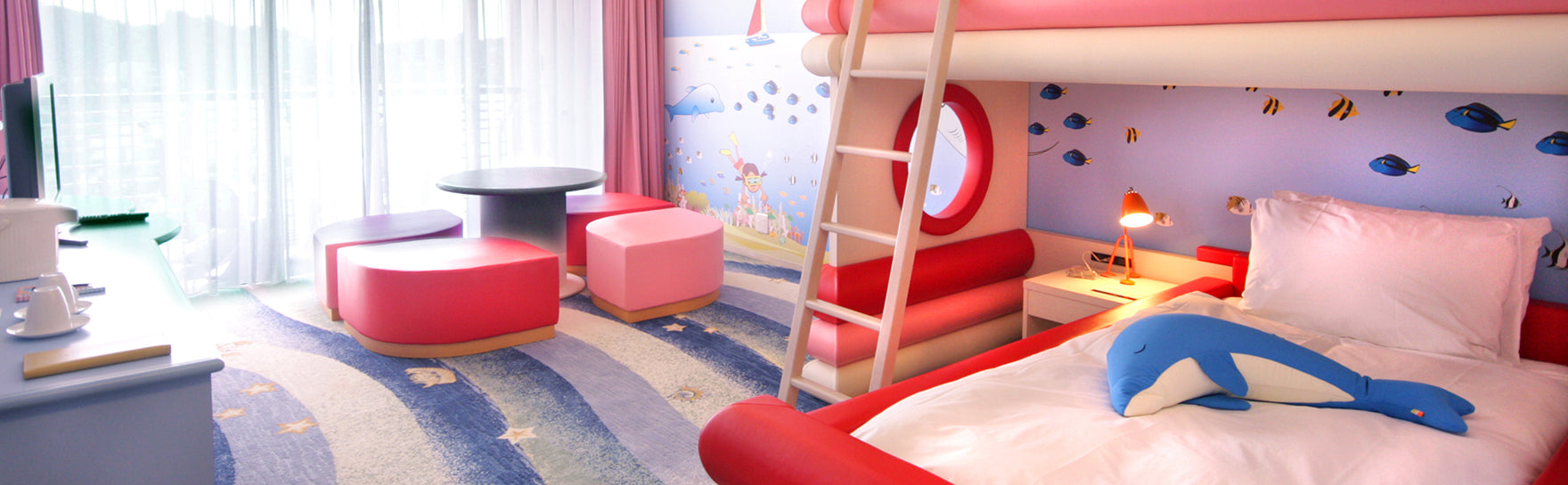 お子様用のパジャマやステップはもちろん、遊び心あふれる仕掛けが満載の客室。
