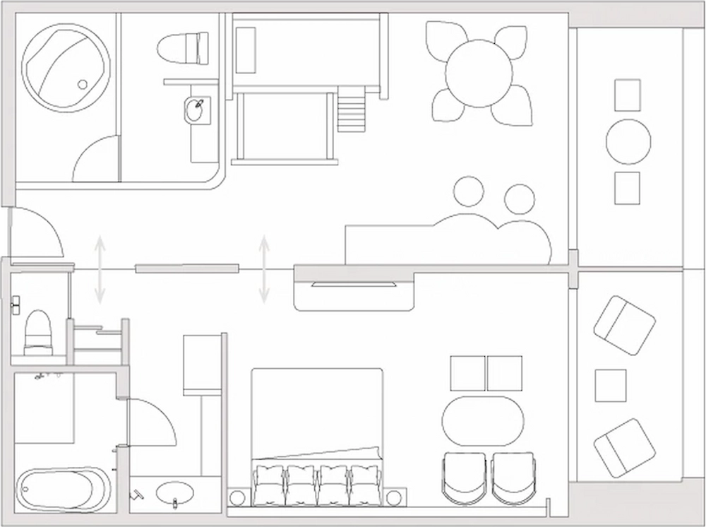 内ドアで行き来できるダブルルームのベッドは、スーパーキングサイズを導入し、ゆったりとお休みいただけます。