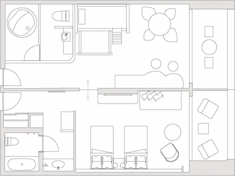 内ドアで行き来できるお部屋には、贅沢な広さのベッドをご用意。やわらかな寝心地に包まれ、快適な時間をお過ごしいただけます。(ダブルルーム / ツインルーム)