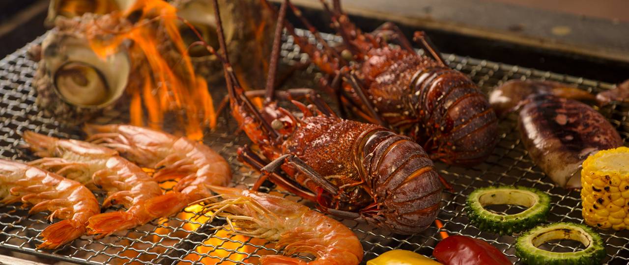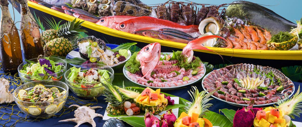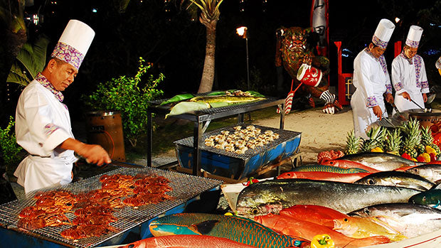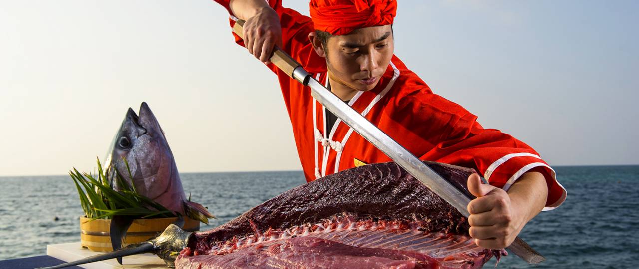 豪快なマグロ解体ショーのパフォーマンス、獲れたての新鮮魚介を目の前でシェフが焼く海人バーベキュー。