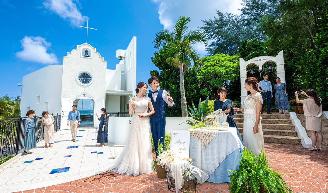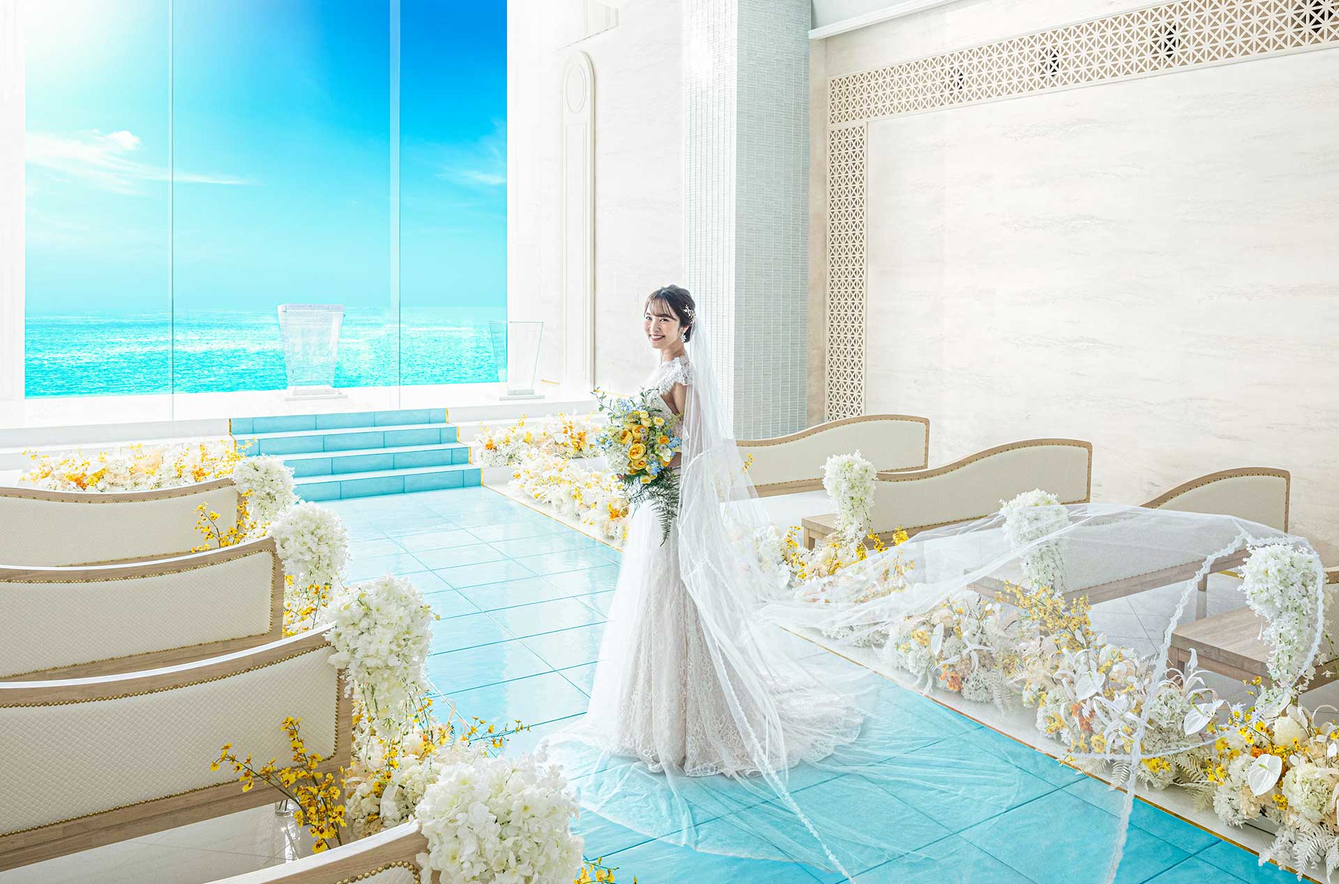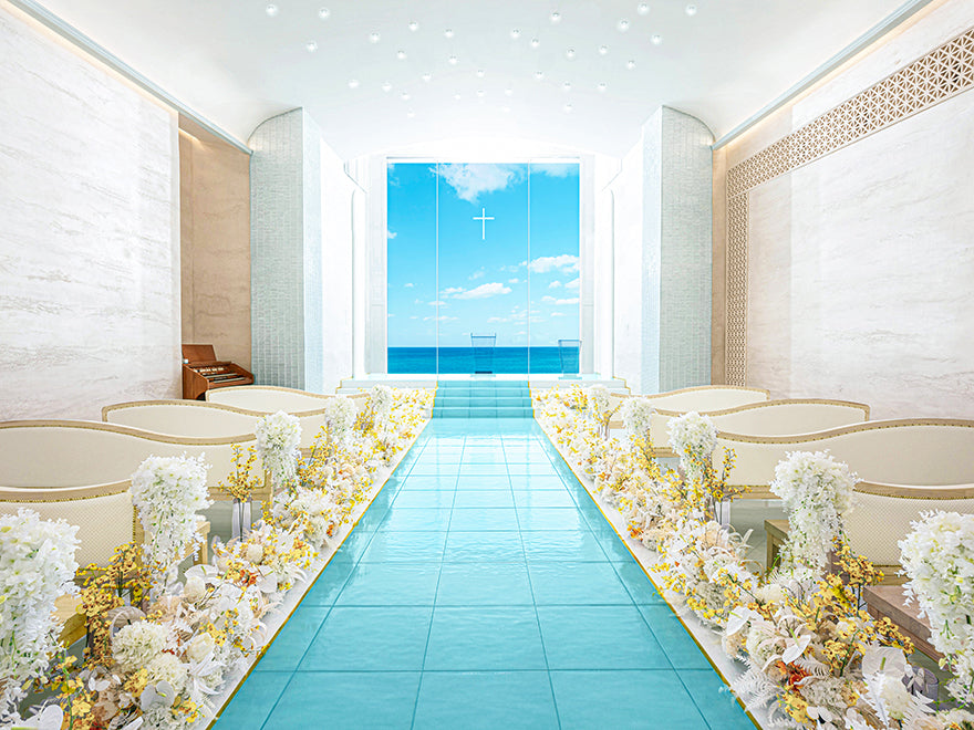 神聖な海辺のチャペルでの挙式、青い海がきらめくビーチサイドでの