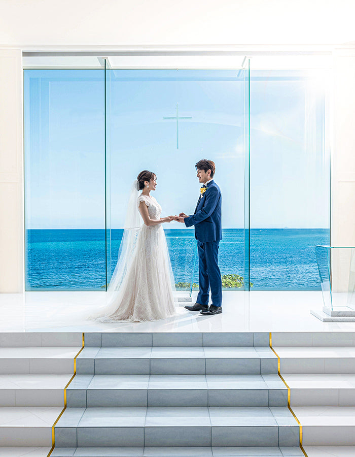 祭壇の向こうに広がる海を前に、永遠の愛を誓い合うセレモニーを。